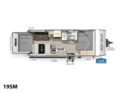 Sleeps 6 Slides 1 Length 24 ft 3 in Ext Width 8 ft Ext Height 10 ft 8 in Hitch Weight 616 lbs GVWR 7616 lbs Dry Weight 5076 lbs Cargo Capacity 2540 lbs Fresh Water Capacity 52 gals Grey Water Capacity 38 gals Black Water Capacity 38 gals Number Of Bunks 1 Available Beds Two Queen Number of Awnings 1 Awning Info 15' Axle Count 2 Shower Type Tub/Shower Combo Similar Travel Trailer Floorplans