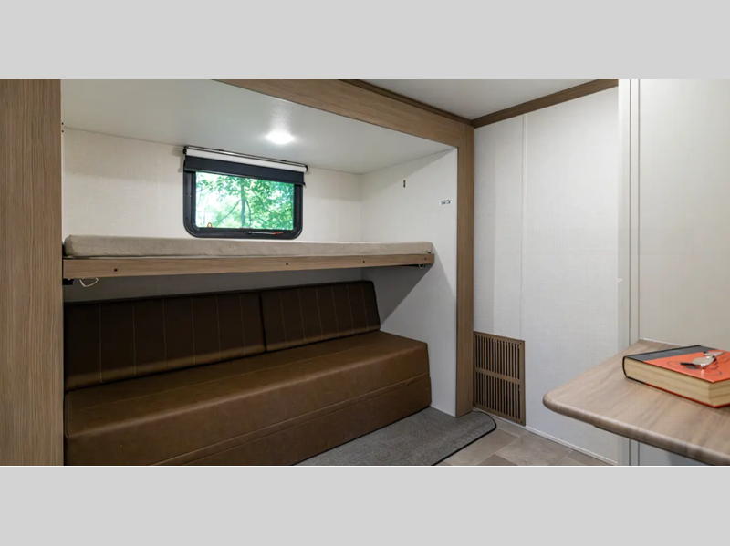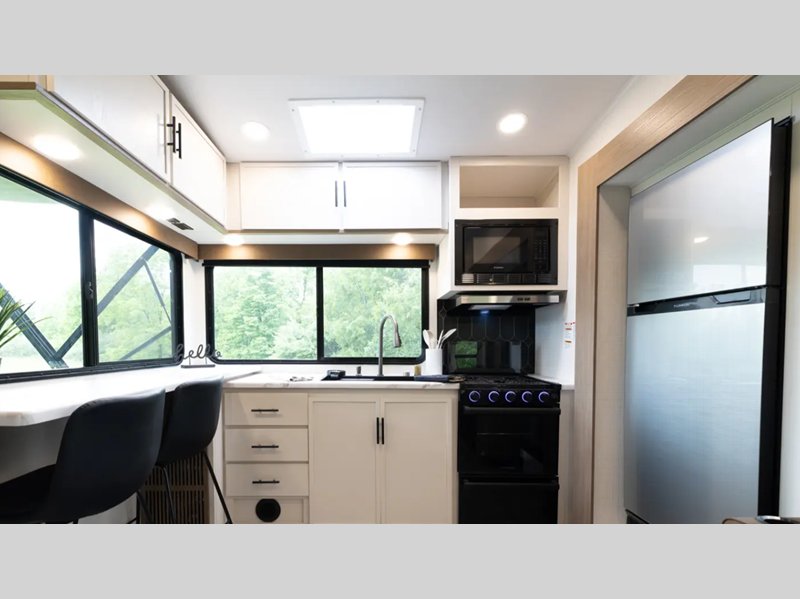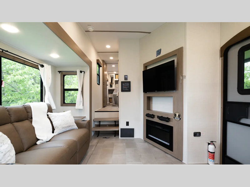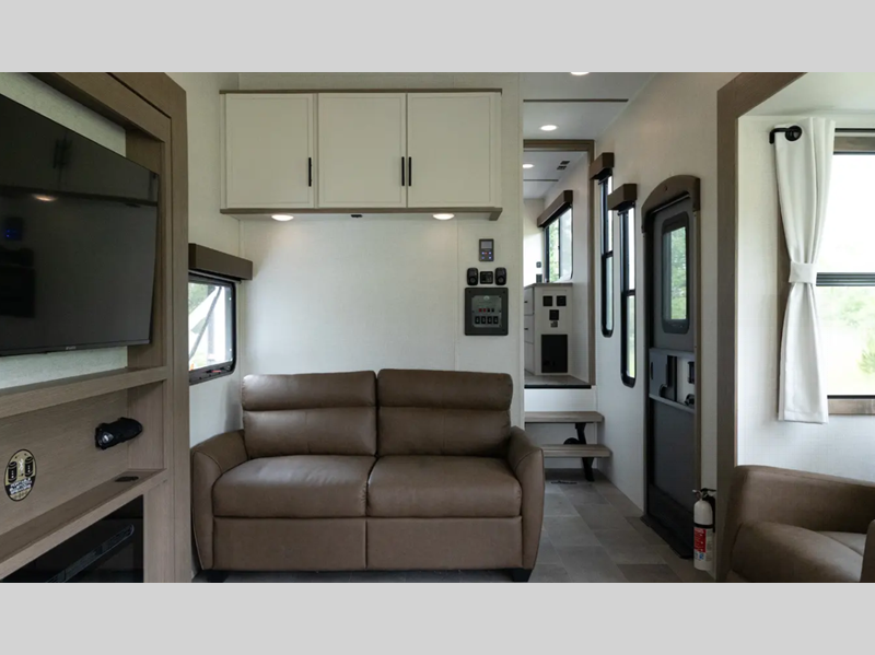 Each fifth wheel is constructed with an vacuum bonded aluminum structure with laminated aluminum sidewalls, slide boxes, a front wall and floor, plus one-piece Tufflex PVC roofing for more strength. The exterior offers a black tank flush, winterization and sanitation an enclosed docking station, and off-grid camping including a solar on the side prep. The interior includes residential linoleum, blackout curtains and roller shades, residential backsplash, and oversized opening windows for great views and circulation of natural air.