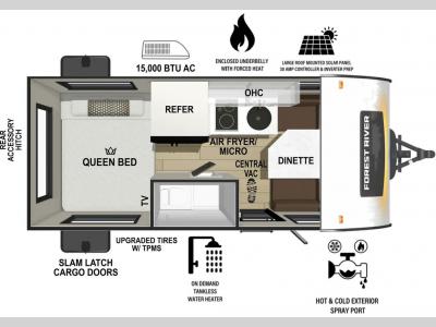 With any R-Pod travel trailer by Forest River, you will enjoy affordable luxury at the lowest tow weight in its class! There is a sealed underbelly with forced heat, a curved dual-pane acrylic front window with a bug screen and night shade, plus a large roof mounted solar panel for off-grid capabilities. The 15K A/C unit will keep you comfortable during the summer camping months, and the tankless water heater will provide endless hot showers after hiking, biking, swimming and more! Each model also includes a black glass friction hinge entrance door, roof ladder prep, exterior motion lighting, plus a hot and cold exterior spray port to wash off sand from the beach. Inside, you'll enjoy seamless Surf-X kitchen countertops, blackout roller shades, and a central vacuum system for hassle-free cleaning!